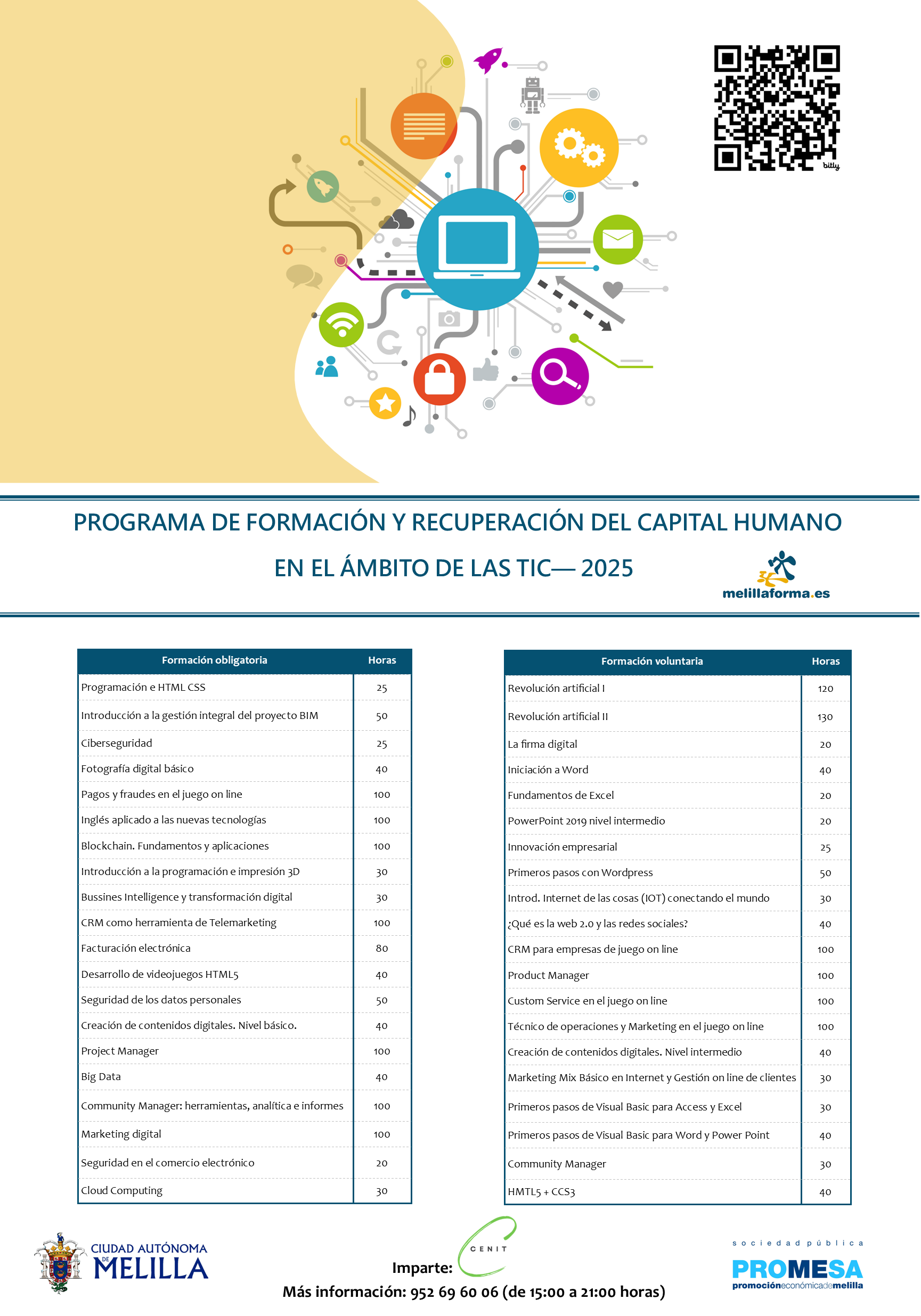 La Ciudad Autónoma de Melilla, a través de la sociedad pública Proyecto Melilla, organiza una nueva edición del “Programa de Formación y Recuperación del Capital Humano en el ámbito de las TIC”, a través de itinerarios de formación presenciales, semipresenciales y online, en el ámbito del comercio electrónico, el marketing digital, la creación de contenidos digitales, la innovación, el juego on-line o las tecnologías de la información y las comunicaciones (TIC), destinado a la formación, proyección, reciclaje, reconversión y recuperación del capital humano en el sector de las TIC en Melilla.